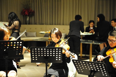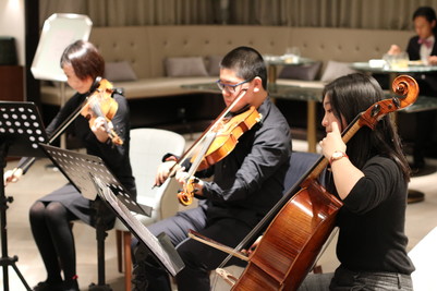 Decorated with golden balloons and velvet, Mia Fringe was filled to the brim with excitement. Participants lined up to take photos at the intricate photobooth, while others signed their names on the signature board. There was a plethora of small activities—including cards and fear pong—to participate in. Then, everyone’s favorite time—dinner—came, which featured delicious buffet options including chicken penne, lasagna, salmon, and other exquisite delicacies. While everyone ate, four students performed a live string quartet to accompany that night’s dining.