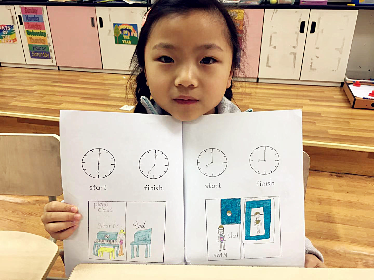On December 29th, grade one students at SHSID Pudong shared their weekend schedule during math class to reinforce their sense of time. For their weekend homework, students had to log what time they completed different activities during their weekend and show what time they did so on the clock face. During this interesting math project, students applied time expressions and their sense of time in daily life and were taught how to manage time wisely.