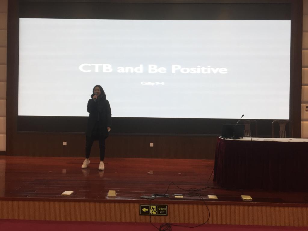 On Wednesday, January 2, 2019, the 9th grade students of SHSID gathered in the Xianmian Building Annex during P&B to attend an inspiring lecture by Cathy Zhang from class 9(4). Her lecture was centered around what is perhaps the most well-known competition amongst the grade 9 students: CTB, or China Thinks Big. She aroused the audience’s interest by first asking CTB participants in the audience about their experiences in the competition. Most found that participating in this competition was stressful. Cathy, however, followed this by presenting a completely different view. To her, CTB was fun. She admitted that CTB was stressful but told her fellow students that the stress and big work load also meant a great chance to improve “time management, research skills, and team corporation”.
