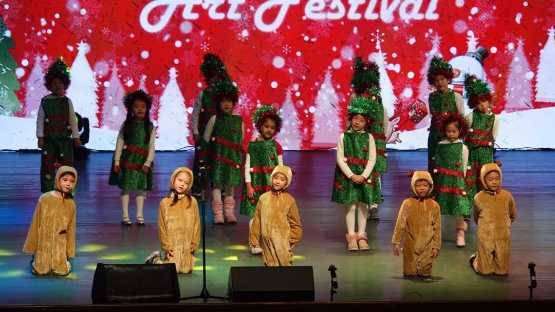There were about 15 amazing performances at this Christmas themed Art Festival including choruses, orchestras, dancing, and more. After nearly two months of effort, the little artists finally got on the stage in their colorful costumes. Some of them played the snowmen or Christmas trees, and they all danced happily with the music. Some played the ukulele, while others sang beautiful songs. Some played different instruments together, leading the audience into a wonderful musical world. Teachers also brought us an impressive performance, and with their enthusiasm, they won a burst of applause. Lastly, when “All I Want for Christmas is You” started, all the audience was mesmerized by the little dancers of the musical club, following the melody, and bringing this event to a climax!
