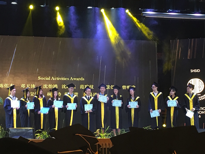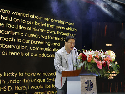 The school Wind Ensemble initiated the ceremony. When the march was over, everyone saluted to the four graduates for their last performance with SHSID Wind Ensemble. Principal Feng delivered a speech to review all the achievements made by students from the Class of 2016. He also sent his best wishes to all graduates. Jeffrey Fu, student representative, and Chelsy Wu’s father, delivered speeches to send their best wishes to all students. A wide range of awards were announced, including Awards for Excellence in Sports, Awards for Good Behavior and Awards for Rapid Progress. Students who got Social Activities Awards, Good Study Awards and Excellent Study Awards came to the stage to be awarded. When the video of 10 Honors Students Candidates was released on the screen, everyone applauded for their great achievements. The host announced the names of 6 students who finally won this title. They, as well as their parents, were invited to the stage and were awarded by Principal Ma.