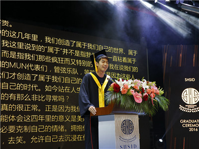 Principal FENG ZHigang, Head of SHS and SHSID, Mr. Ma Feng, High School Principal, Mr. LIU Lian, Middle and Primary School Principal, and all other directors attended this graduation ceremony. At 9 o'clock, parents entered the auditorium. The photos of the Class of 2016 were displayed on the screen. With the host’s official announcement of the opening of the graduation ceremony, all graduates, wearing the graduation gowns, entered the auditorium, surrounded by the applause from all parents and teachers.