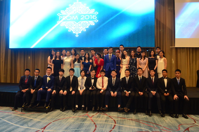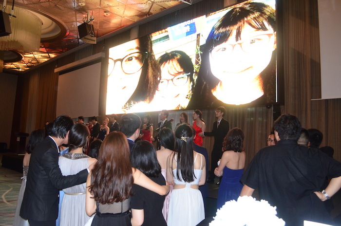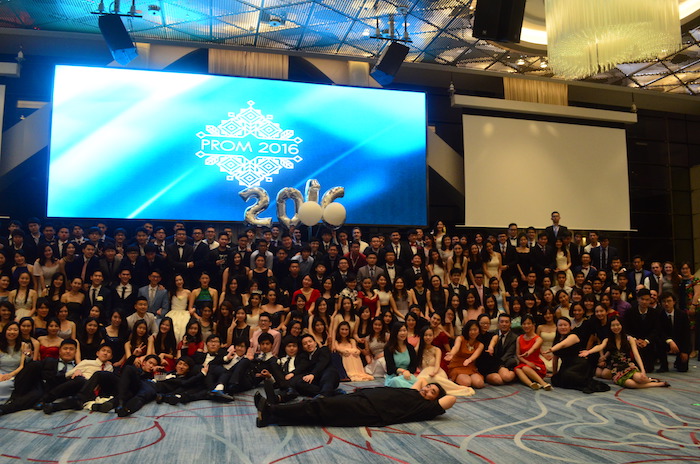 At 6 o'clock, the PROM started. The students had the delicious dinner first. And after that, the programs such as performances, lottery etc. started. The first climax was the PROM video. The photos about their school life and words from the teachers were At the same time, they received a letter from their parents. A lot of students were deeply touched by their parent's letter and the video for their best memories. When the lights on, the students gave a big hug to their friends and teachers and told them how they are thankful to them and how they love them, It was such a moving scene. At this moment, they grew up. After that, another highlights , announcement of PROM king and queen, came. It was the second year that double Kings were elected. They went to the pool to lead others to dance. At last, a photo of whole grade was taken and the PROM ended.