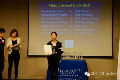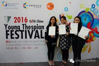 On May 14 and May 15, Esther Cheung 9(11), Teresa Xiao 9(8), and Tiffany Zhang 9(8) participated in the "2016 EDTA Drama Festival". Esther and Teresa took part in the improv completion on May 14; on May 15th, all three students participated in the 24 hour competition. In both competitions, contestants had no way of preparing, this was different from performing a play we rehearsed for a semester. There were only 24 hours (actually only 5 hours counting from the time of actual rehearsal to the time of performance) from the first time contestants saw the script to the actual performance. The three students--participating in the festival for the first time--tried their best to achieve awards. Esther Cheung won two individual awards--"best humor" in the improv festival and "best movement" in the 24 hour theater festival. Teresa Xiao won "outstanding troupe" and "audience favorite" in 24 hour theater, while Tiffany Zhang won "best troupe." We are looking forward to more outstanding accomplishments in the future.