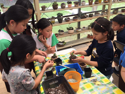 On May 12th, the fourth graders went to a Cactus Theme Botanical Garden in Century Park for a visit. They walked around the garden and saw a variety of cactus and plants. Providing the tools and seeds, students planted the small cacti into the pot and watered them. After the students were done, they finished with an energetic water fight which was really fun.