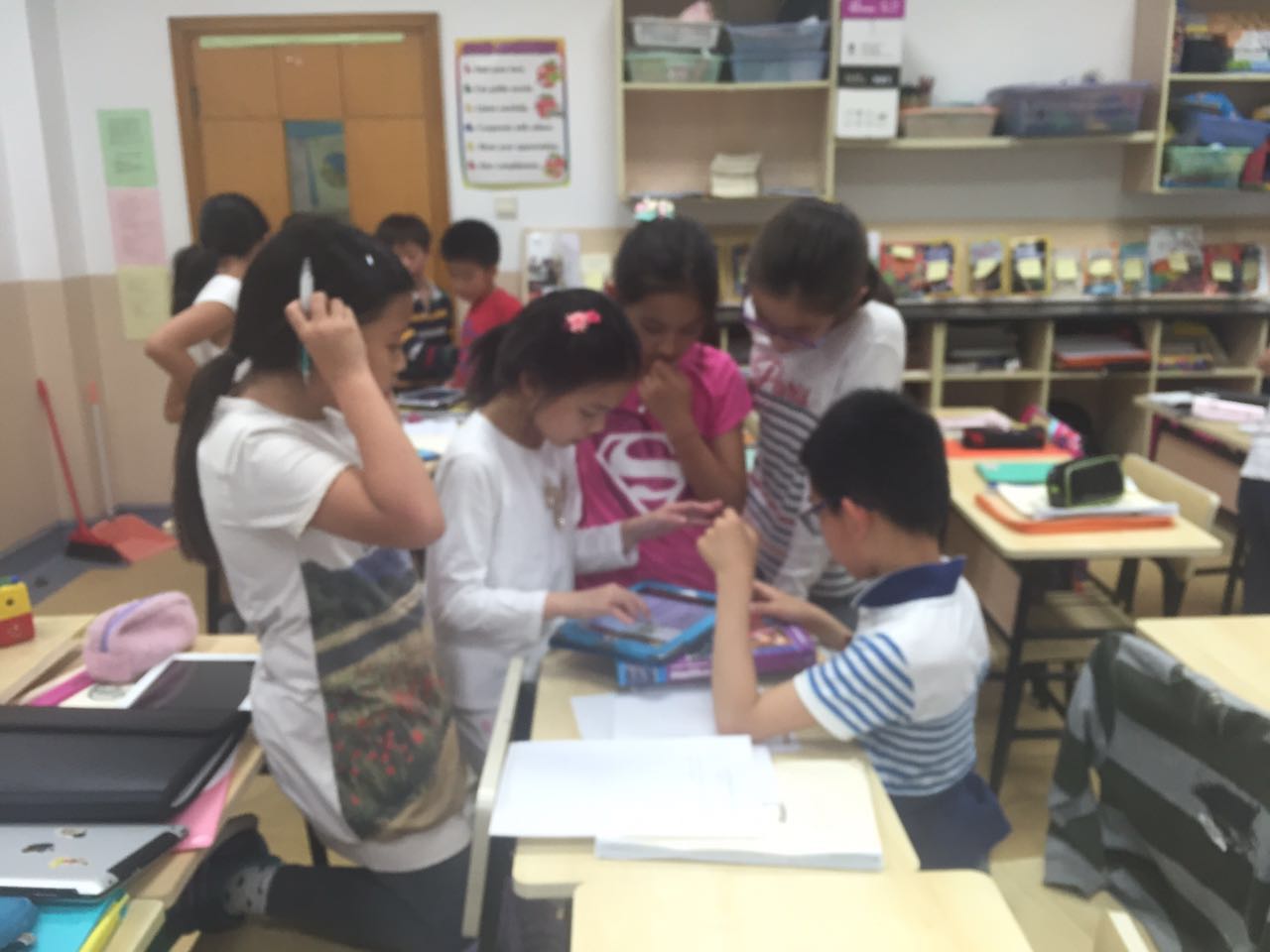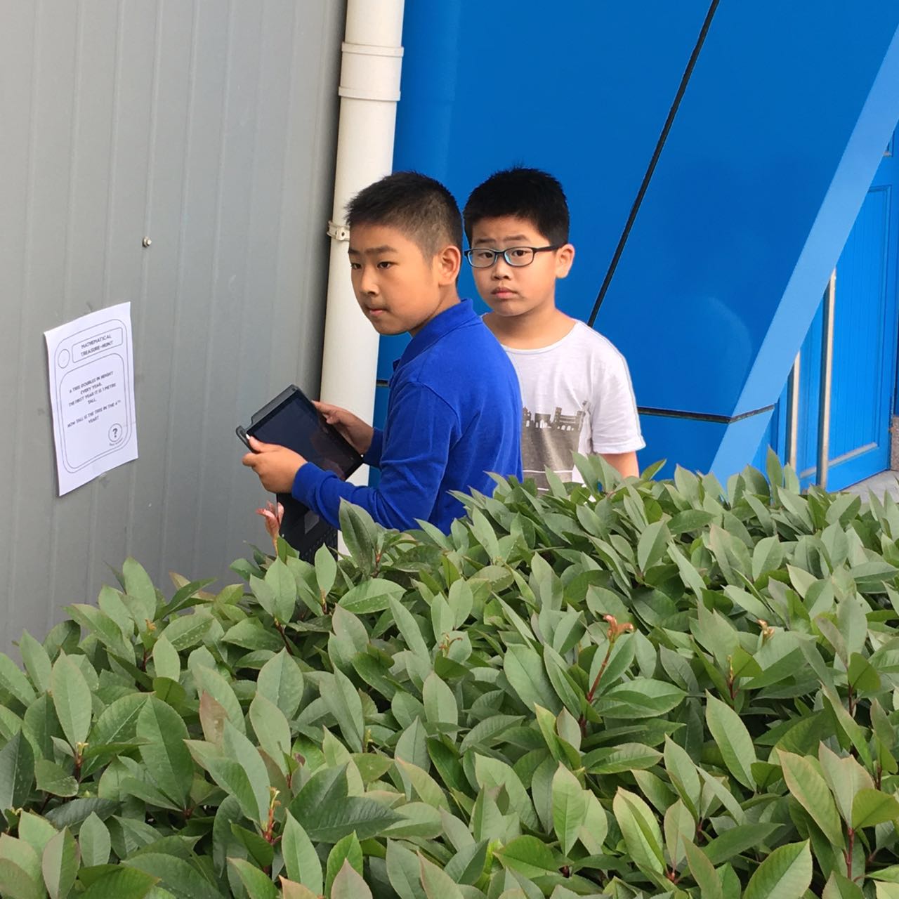 Grade 3 students attended a math activity on May 5th: Treasure Hunt. The treasures were math questions. Teachers hid question sheets outside in places like bushes, the playground, and the basketball court. Students worked in groups, brought one iPad and took photos of all of the questions. They were very active and went to find out the answers to the questions, and then they went back to the classroom and solved all the questions. Students were very excited and showed lots of interest in this activity. This activity offered students a good chance to focus on their study while having some exercises.