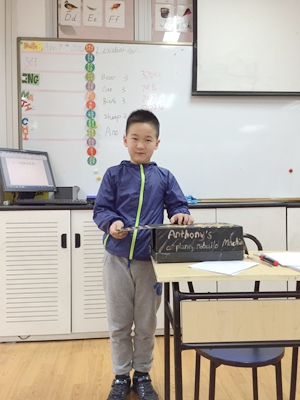 Students impressed us with their creativity and speaking skills during presentations. We were delighted to see students bring in inventions of all sizes, shapes, functions, and purposes. Many students had the environment in mind and created inventions that would prevent pollution and clean the earth. Others focused on practicality and created items that could help us in our daily lives with homework and chores.