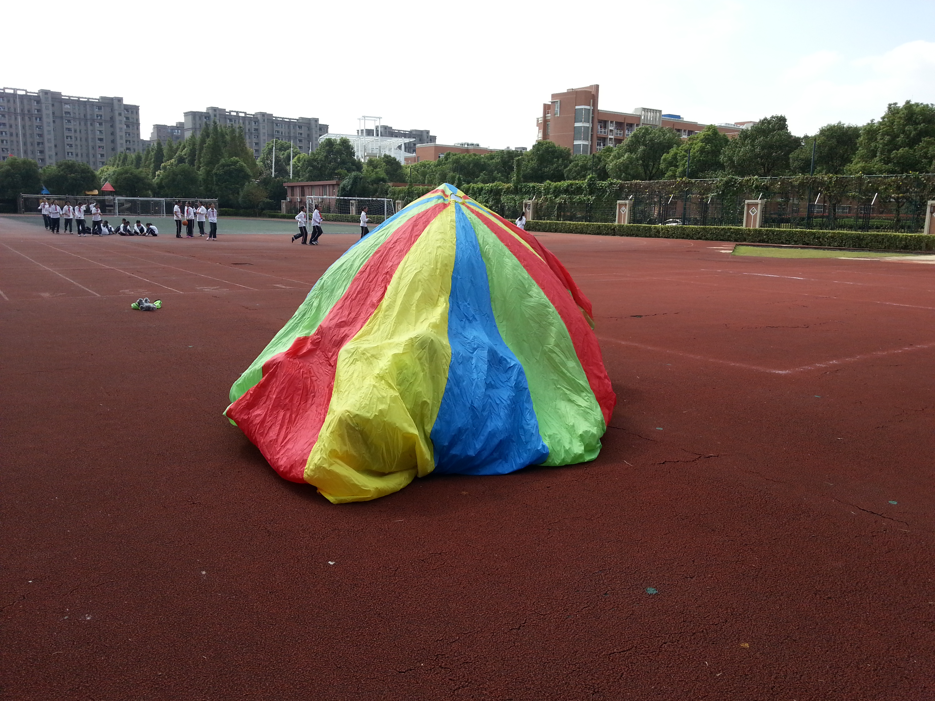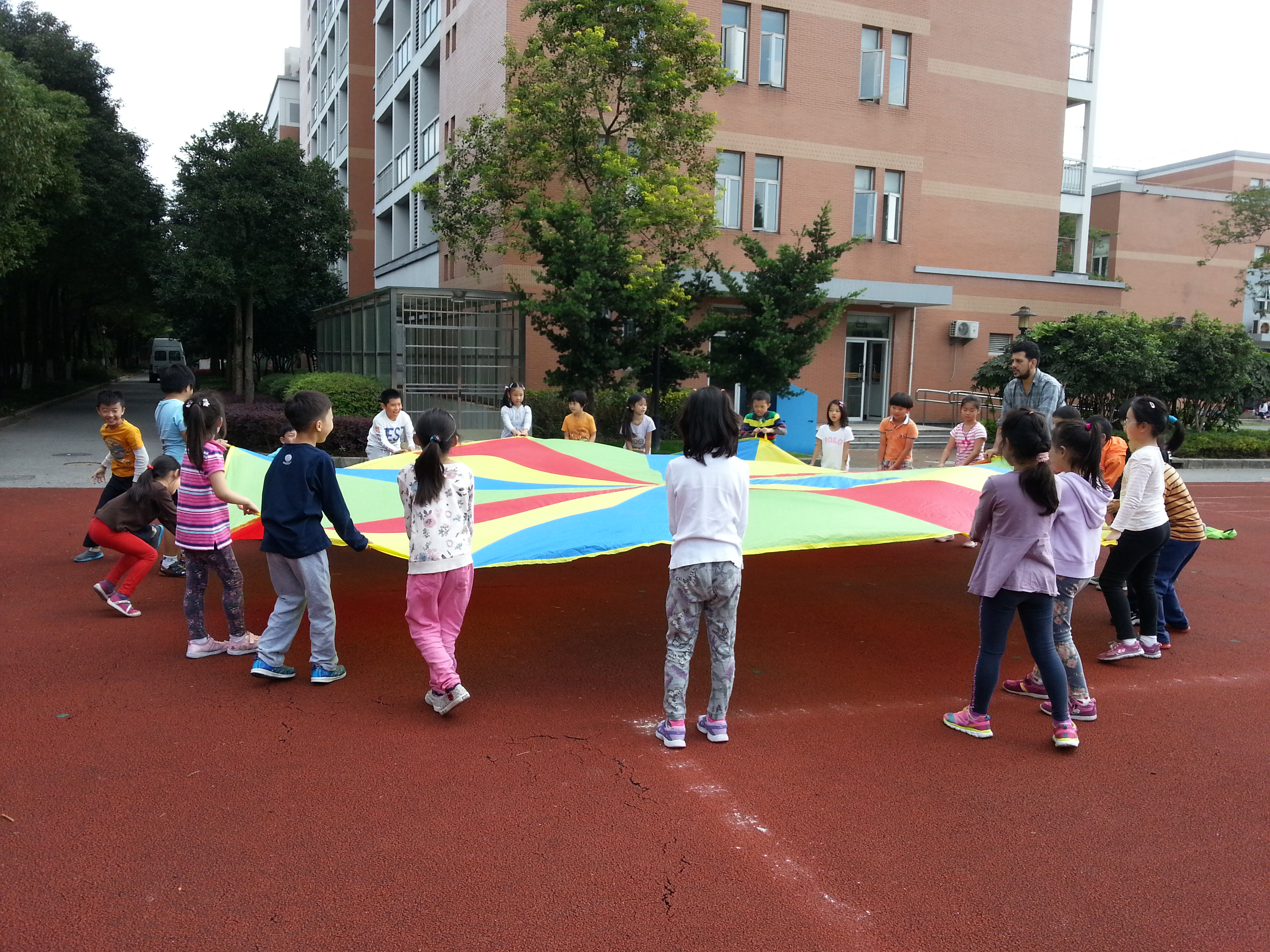In this activity class (week 8), Grade 2 kids played the Parachute Game with their teachers. Kids stood around the parachute and played a lot of games through down or up the parachute, like making a huge mushroom and participating in some catch games. They really liked the new outdoor games!