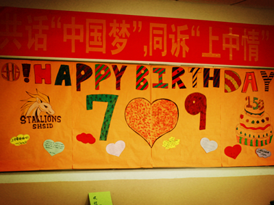 Exquisite posters, best wishes, dazzling banners, were all part of decorations the 7th grades used for each classroom to mark this special birthday. Please enjoy the following pictures: