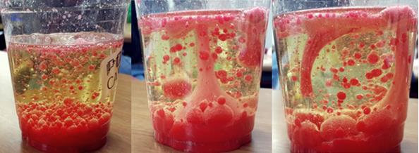 Our club’s first experiment was about volcano eruptions. Materials that were used included a half cup of oil, water mixed with red paint, and foam vitamins. First, the oil and red colored water are poured into a plastic cup at a ratio of 3:1. Due to the different density, the red water sinks to the bottom as the oil floats on top of it. After that, the foam vitamin is dropped into the cup, causing the red colored water to slowly rise and burst. Unlike other science experiments, this experiment’s materials don’t cost a lot of money, because these they are easily found everywhere. This experiment was also just perfect to finish in a short amount of time.