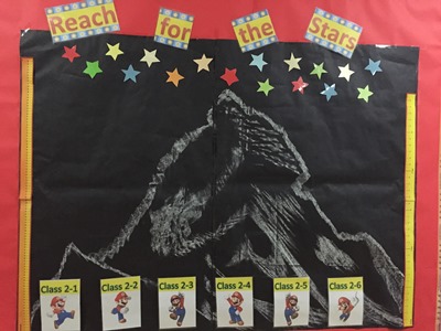 Each class has its own poster in the hallway. When students achieve a goal, they can help their class climb up the mountain on their class poster. The more students who achieve their goals, the higher the class can climb. When the class arrives at the peak, they can reach the stars.