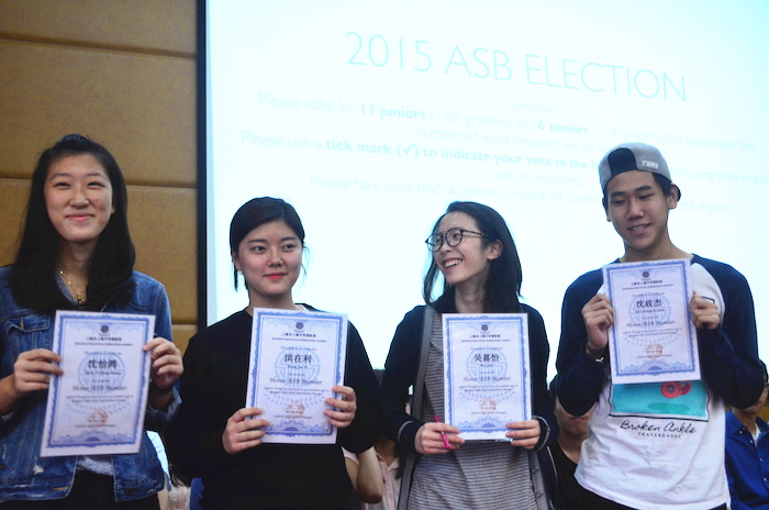 September 16, 2015 – On this sunny afternoon, all boys and girls from the XianMian building gathered in the Annex auditorium ofShanghaiHigh Schoolto elect the new ASB members. Before the election, the Director of Senior High School, Ms Liu, issued a certificate to honor members of ASB. The candidates, who all displayed posters during the previous week, stood on stage to give final presentations. Each candidate spoke for two minutes, in both Chinese and English. Plans for schools parties were proposed, guarantees for more fun were provided, and offers to listen and help were made. At the end, everyone present - students as well as teachers - cast their final votes before heading home. Let’s give all of the candidates a big round of applause for their motivation.