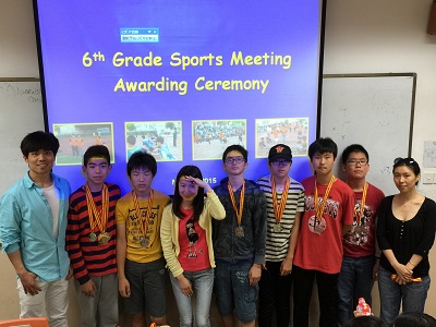 The winners of the Sports Meet got their medals from teachers during the Sports Meet Award Ceremony.