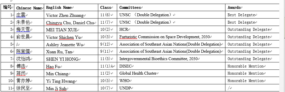 The four-day conference was full of changes and challenges and it was a really intense competition. Our delegates started their training session from the very beginning of this semester. Our club leaders arranged training sessions for them in accordance with every delegate’s strengths and weaknesses. Our delegates represented United Kingdom of Great Britain and Northern Ireland and entered nine committees. Their wonderful performances impressed Chairs from each respective committee. Please see the attached Award List.