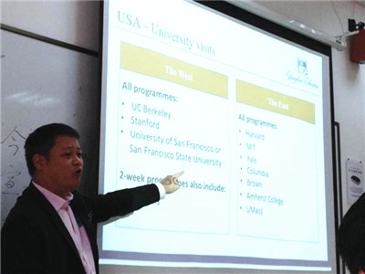 On March 19, 2015, the Kingdom Education Organization gave a presentation about their diverse summer program at Zhongxing Building in SHSID. KE is a nonprofit organization which offers students aged 14-18 the opportunity to live and study on the campuses of leading universities in the United Kingdom, the United States, Australia, and so on. In their summer school programs, students can have a large variety of activities for them to choose. In different programs, students will be able to visit many colleges, such as UC Berkeley, Stanford, Harvard, MIT, Yale, and many more in the United States. In the United Kingdom, students will be able to visit the Oxford University, Durham University and many more. The students can also choose different courses to take so they can get to know different majors in college ahead of time. KE is a great way for students to scan through their college list, and to make an informed decision on which school to apply. The students were very excited about the presentation and asked many questions about the programs.