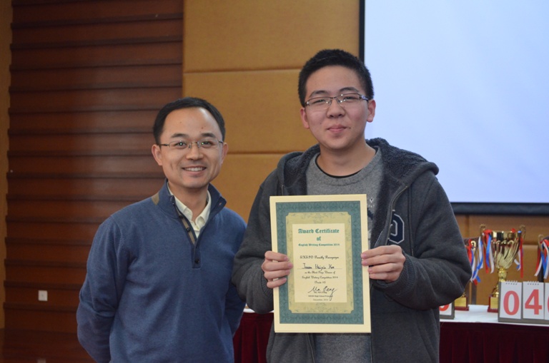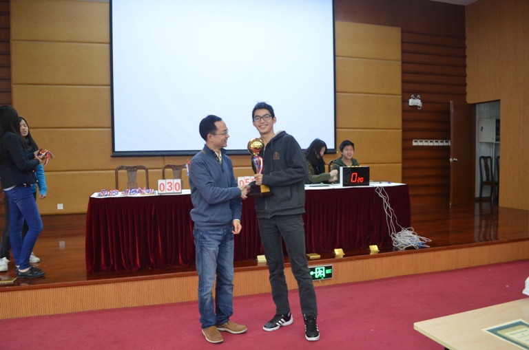 The final Academic Hexathlon Championship, Super Quiz, was held on December 10th. Participants answered questions on History, Geography, Literature, Music, Art and Sports. The Super Quiz was different from the previous written tests, with all the answers given orally and against the clock. The winners were Jayden Liu and Jeffery Fu from 11(1) with Jason Yue from 10(7) and Wilson Liang from 9(2). This team also did well in the other Hexathlon contests, and so became the overall champions. Jeffery Fu won the individual first prize. Principal of Senior High School, Mr. Ma Feng, awarded the prizes.
