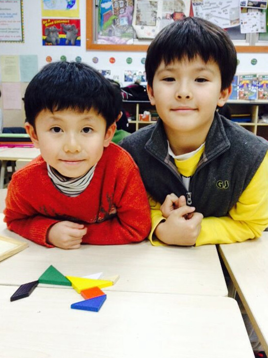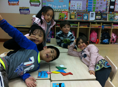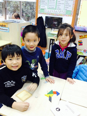 Recently all the first graders are learning different shapes in Math class. To get the students to learn more about the shapes, the first grade math teachers introduced a traditional Chinese toy, Seven-piece Puzzle, to the whole class.