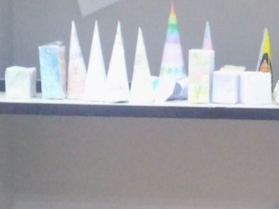 After learning solider figures, we did a special project on the weekend of week 7. Every student got some paper with net from teachers, and they made solider figures by cutting and taping. Everyone made at least two solider figures, like rectangular prism, cube, cylinder, cone. And they even decorated their hand made solider figures.