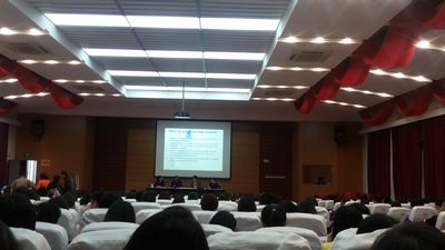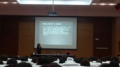 Ms. Liu Min, head teacher of ninth grade, listed the GPA distribution, upcoming activities, and the clubs organized for ninth grade, as well as offering a course preview for tenth grade 10. She also outlined how the parents can get the information from and contact the school. Ms. Jiang, Hao, coordinator of IB & AP, talk about what the IB/AP programs mean to students, and let the parents know how to enroll and prepare them for IB & AP classes. Ms. Zhang Li, one of our college counselors, introduced important websites and materials used for the application process for college, and summer programs across the U.S., and then discussed the benefits of a 4-year plan.