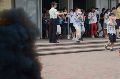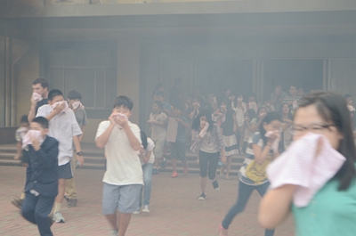 On September 4th 2:20 pm, with the junior high school section of SHSID suddenly resounding with a fire-alarm, all the 8th grade students, covered their noses with wet towel and left the building in order and gathered at the "Safety Area" within the pre-estimated time of 3.5 minutes. This activity is aimed for enhancing everyone's self-protection awareness under dangerous situations.