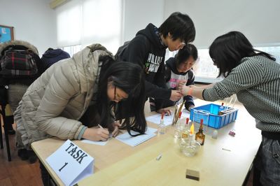 10th graders held a science fair last Wednesday covering six different branches of study: physics, chemistry, mathematics, economics, IT and biology. Various activities were arranged in each classroom which required five students to work together to solve a problem. Students needed to go to each classroom, follow the instructions and try to accomplish as many tasks as possible to collect stamps. The winners were the groups with the most stamps.