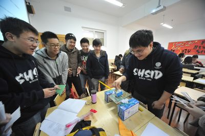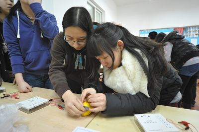 For Chemistry and Biology, some interesting experiments were done: "fruit battery", "color change reaction", "magic brush" and "molecular model”. In the Biology classroom, everyone tried hard to find white blood cells using a microscope.