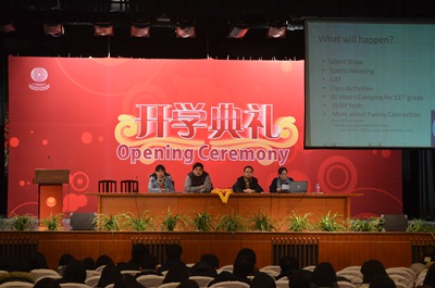 On the afternoon of Feb. 11, the opening ceremony for grades 11 & 12 was held in auditorium. During the ceremony, Director Liu Qin reviewed last term's achievements, and put forward new expectations for the upcoming semester. In addition, the two grade head teachers, Ms. Wu Chen and Mr. Yang Bichunqiu, illustrated new goals for their respective students and proposed the requests. Then, student representatives shared their experiences with their peers. The Principal of Senior High School, Mr. Ma Feng, sent his best wishes to the students. To close the ceremony, we rewarded excellent classes and students from last semester and expressed our wish that all students do even better the next.
