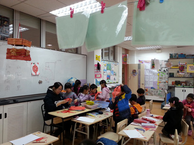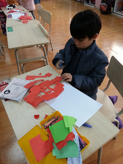 To celebrate the New Year, the art teacher taught the students to make lanterns. At first, the students thought it was very hard to make lanterns because they needed to draw their shapes on the paper, cut them out, and glue them on a new piece of paper. With the help of the teacher, students finally finished their own lanterns! Happy New Year!