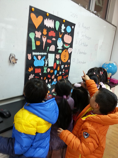 In math class, students put what they have learned in class into practice by making a symmetry poster together. Each student got a piece of colored paper on which they drew half of a shape along a line of symmetry (along which the paper was folded). Then they created their own symmetric shape by cutting along the line they had drawn. Everyone is welcome to have a look at our cool poster!